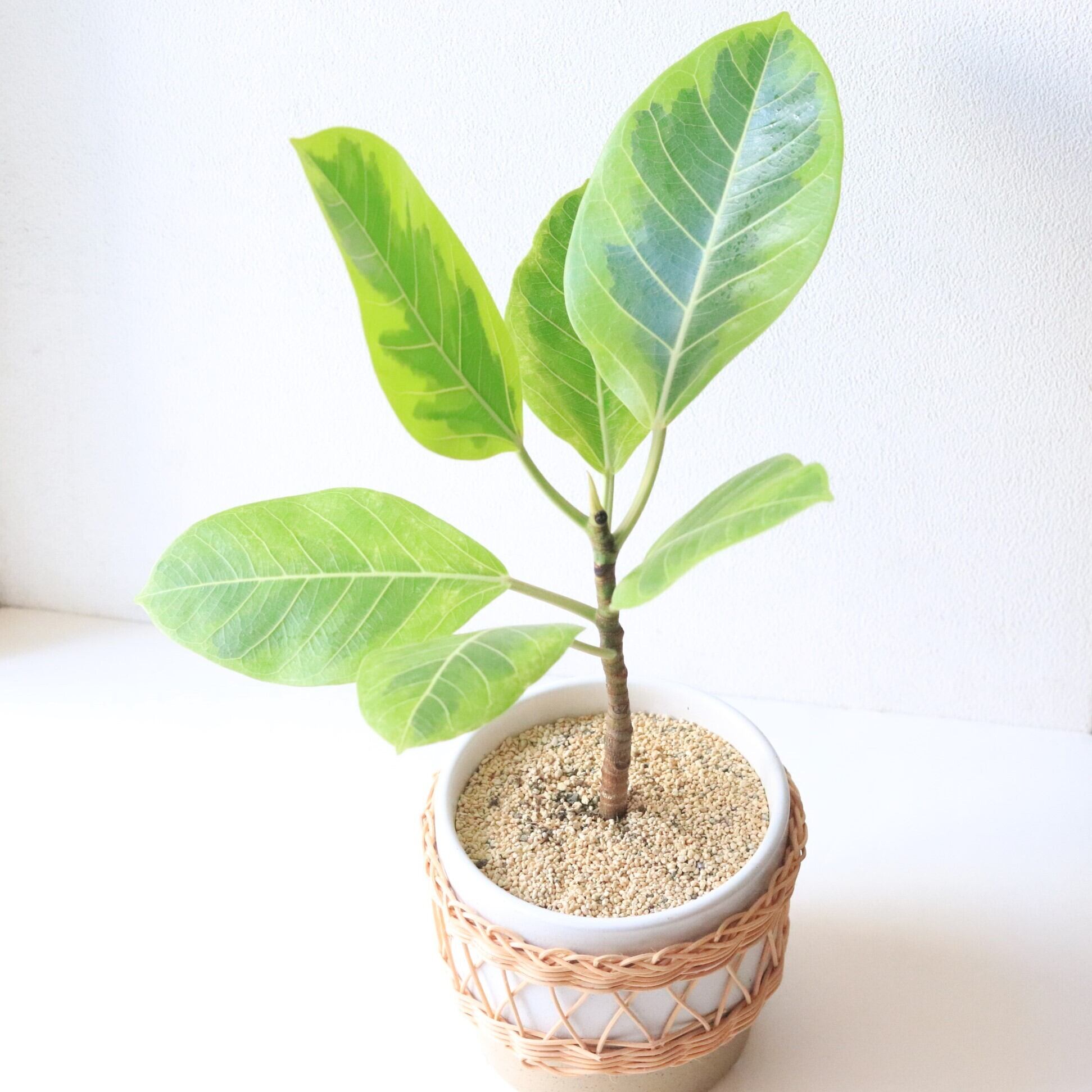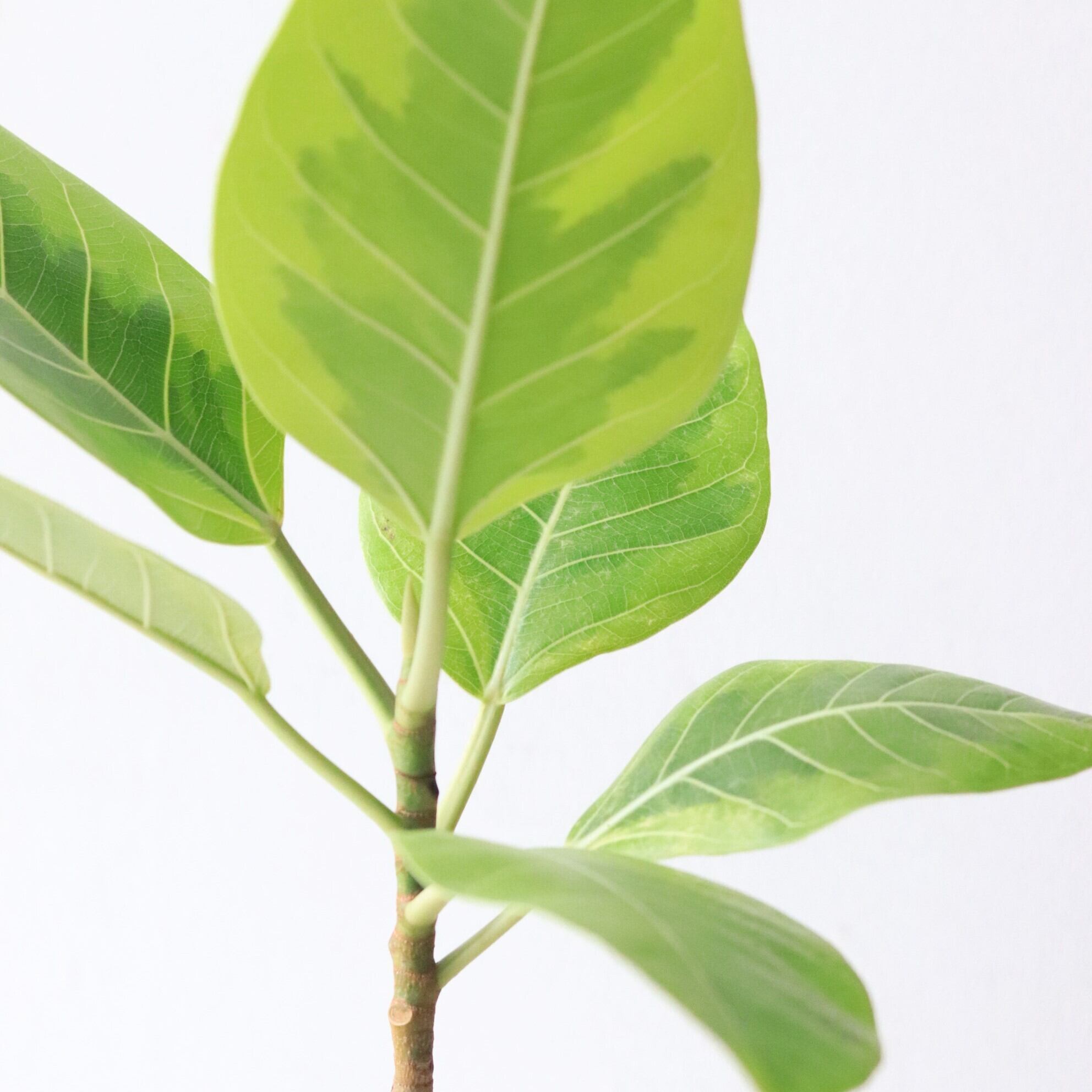 ゴムの木の仲間で、明るいグリーン~黄色の斑入りの葉が特徴の植物です。