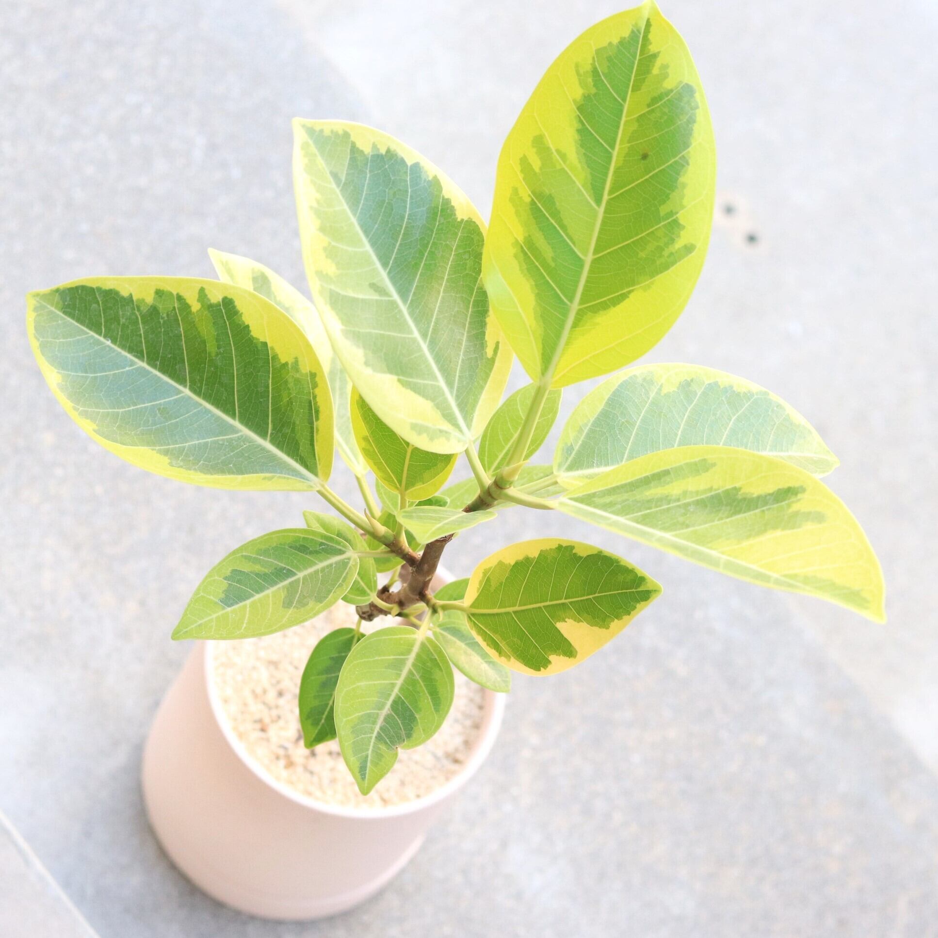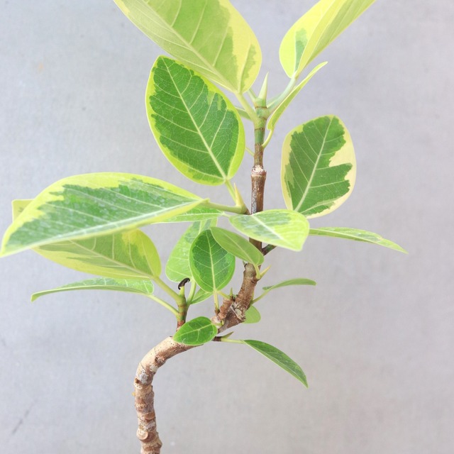 ゴムの木の仲間で、明るいグリーン~黄色の斑入りの葉が特徴の植物です。