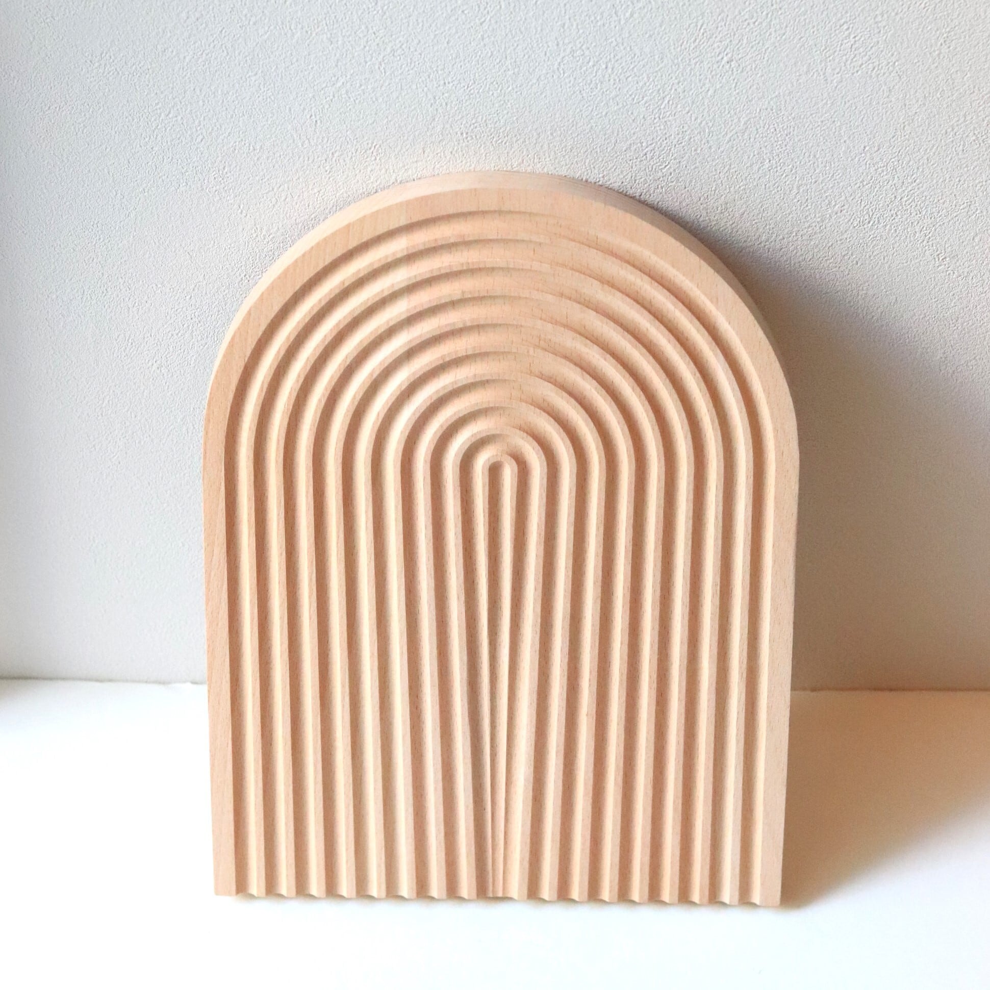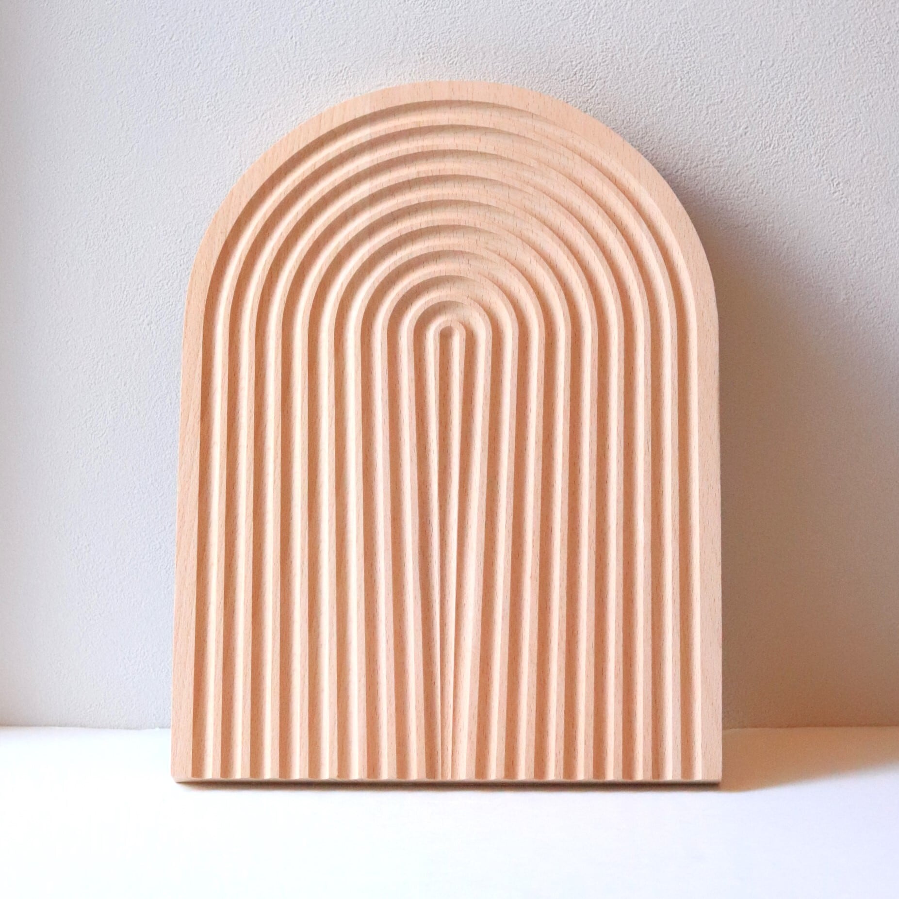 アーチを描いて掘られた陰影が美しい天然木を使ったトレイ。