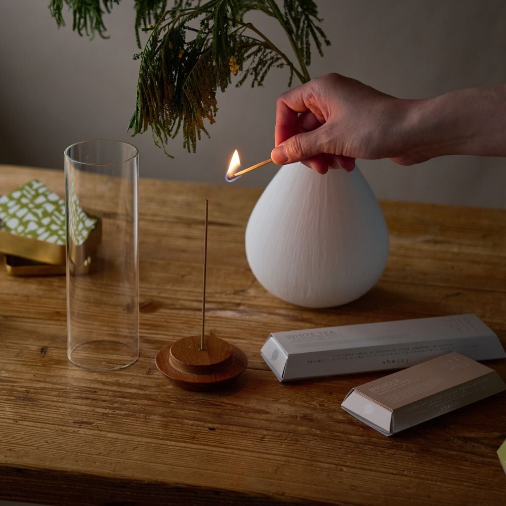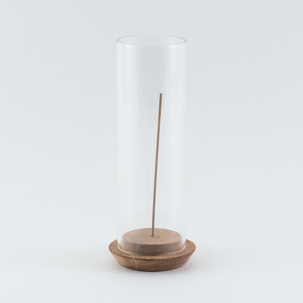 ※本製品はスティックタイプ専用のお香立てです。長さ17cmまでのお香の使用を推奨します。17cm以上の長いお香を使用すると灰が製品の外に落ちる場合がありますのでご注意ください。製品中央部の穴にお香を差し込んで使用してください。使用後は、毎回落ちた灰を拭き取ってください。職人が一点ずつ手作業で制作しているため、色・形・大きさに個体差があります。周囲に燃えやすいものを置かないでください。使用中はその場から離れず火の取り扱いには十分ご注意ください。必ず目の届く場所でご使用いただき、小さなお子さまやペットの手が届くところで使用しないでください。平らなところに置いて安定した状態でご使用ください。ガラスにヒビ、カケの入ったものは絶対に使用しないでください。ガラスの表面に細かなしわが寄ったり、 細いラインのようなものや不純物が入ったり、 小さな気泡や黒い斑点、 突起、ガラス表面にスレや傷が見られる場合があります。ガラスを洗浄する場合、クレンザーやガラスに傷のつく研磨材または研磨材粒子のついているスポンジなどは使用しないでください。木製部分は、最低限の木工加工にとどめている為、木に含まれる樹脂が浮き出て色移りする場合があります。特に、温度・湿度が上がる場所でのご使用は樹脂が出やすくなりますのでご注意ください。また、直射日光に当たる場所やエアコンの風が直接当たる場所では、木の反りや割れの原因となりますのでご注意ください。汚れた際は、乾いた布でのお手入れをおすすめします。水拭きすると色移りする場合がありますのでご注意ください。