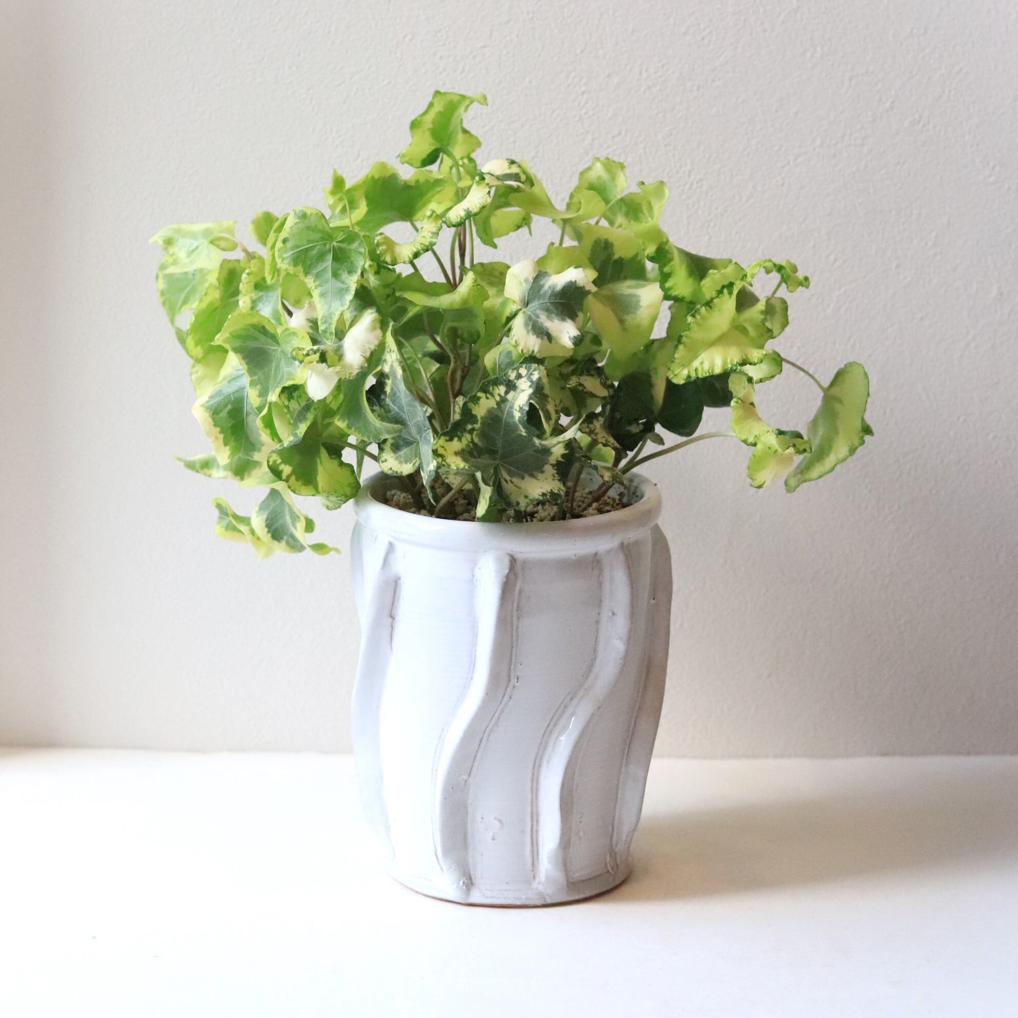 白色のデコラティブな模様の鉢とセットです。(底穴なし)