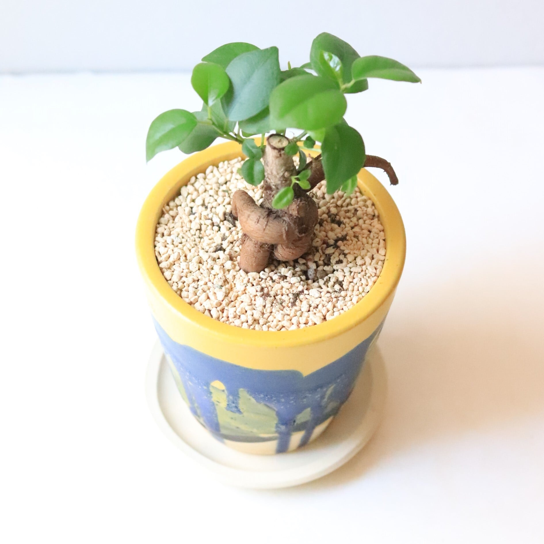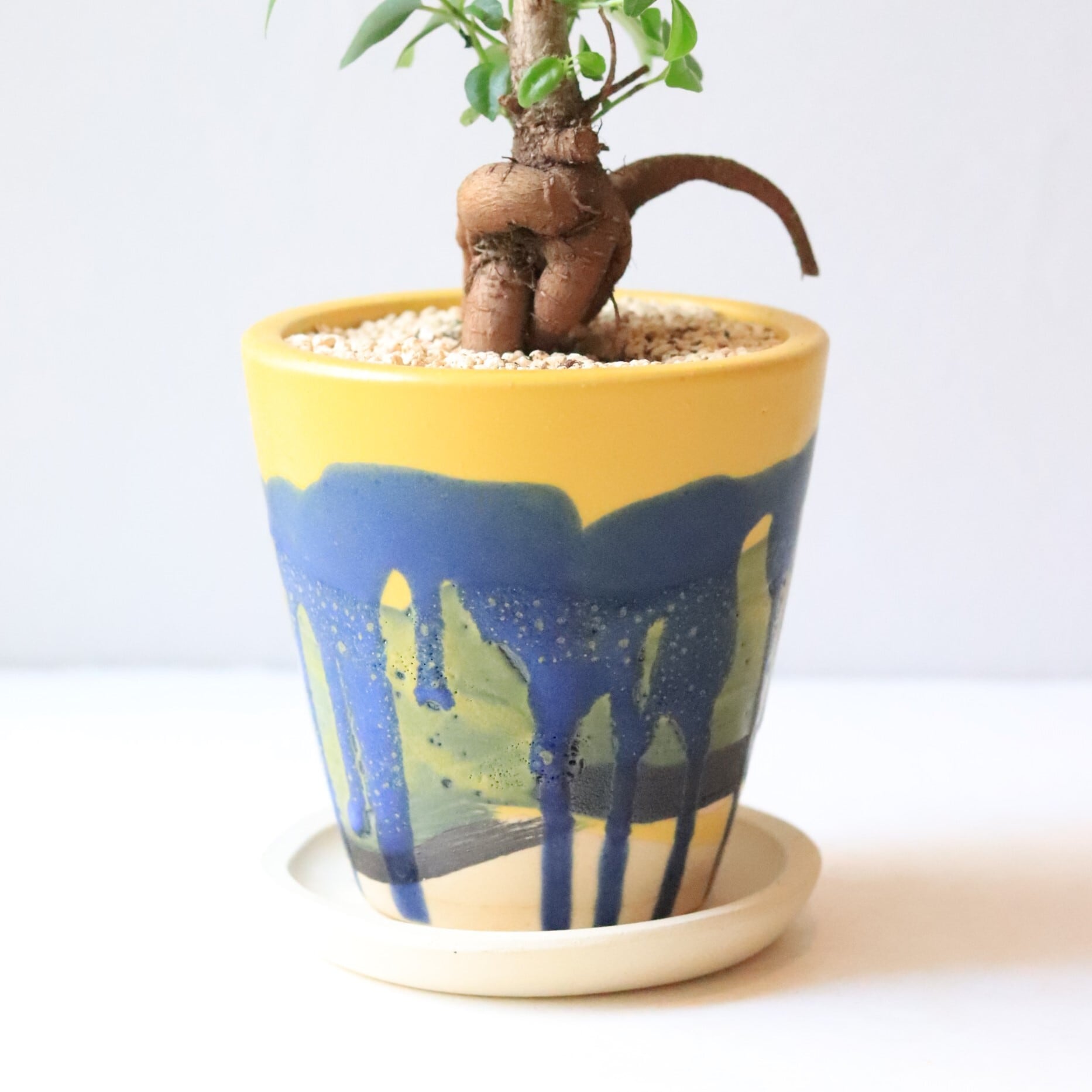 ビビットな黄色と青色が特徴の信楽焼の鉢と受け皿のセットです。