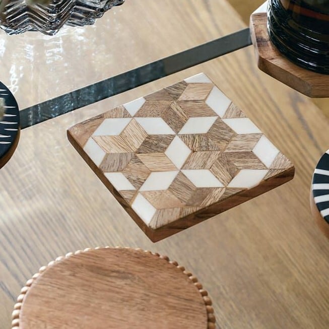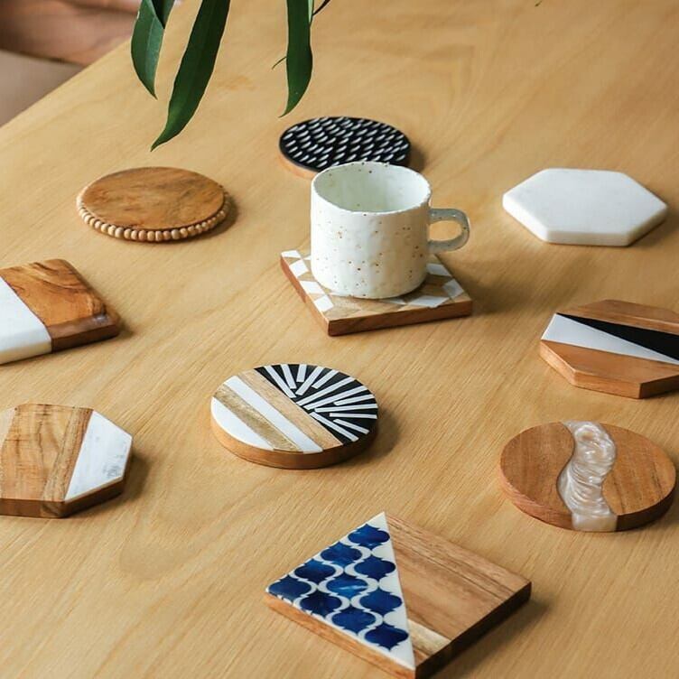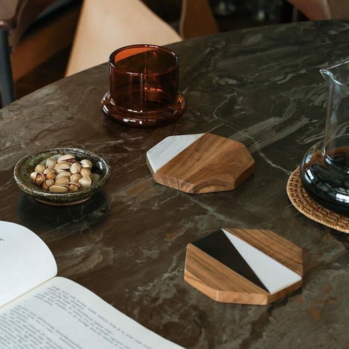 様々な木材と、大理石やレジンとの組み合わせが、個性を光らせます。