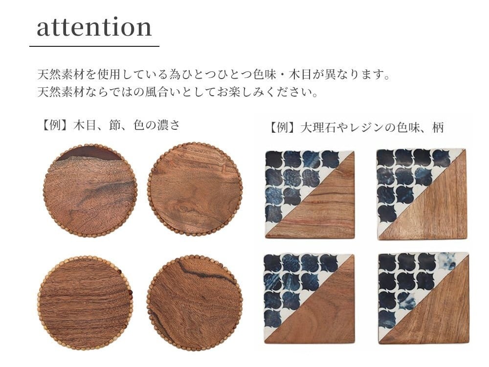※本品は天然の木材や天然大理石を使用しております。長時間水に浸したり、洗わないようにご注意ください。使用後は水分を拭き取り、しっかりと乾燥させてください。本製品は天然素材を使用している為ひとつひとつ色味・木目が異なります。 天然素材ならではの風合いとしてお楽しみください。天然の木材の為、直射日光、冷暖房器具、加湿器などによる過度の湿気や乾燥はお避け下さい。変形及び変色の原因となります。複数ご注文いただいた時に色味が揃わないことがあります。ご了承ください。本品は用途によっては大変滑りやすくなっております。同梱されている滑り止めシールをお好みでご使用ください。ひとつひとつ手作りの為、仕上がりに個体差がございます。手作りならではの特徴をお楽しみくださいませ。