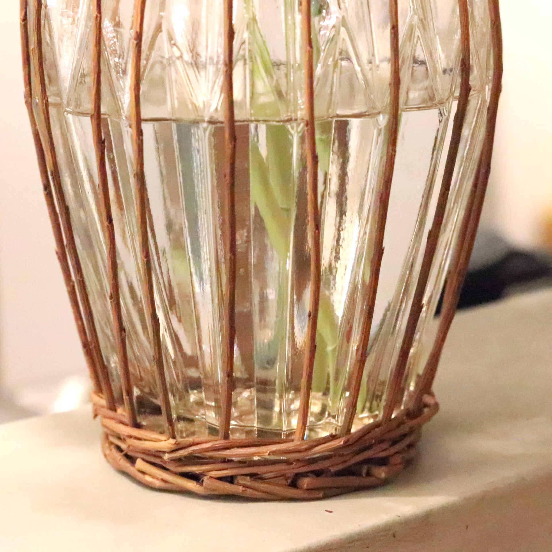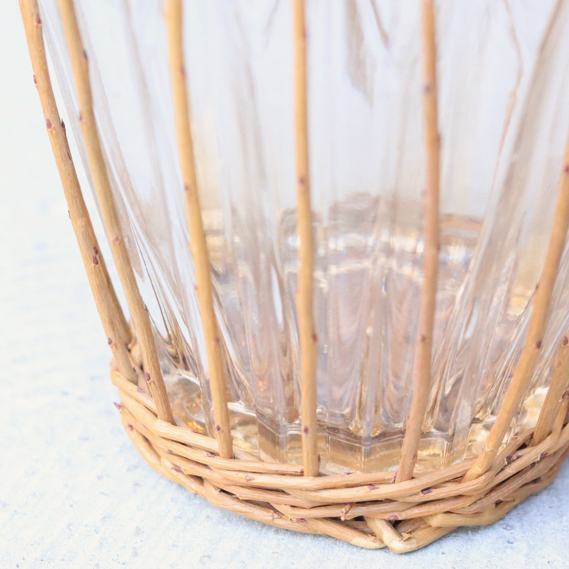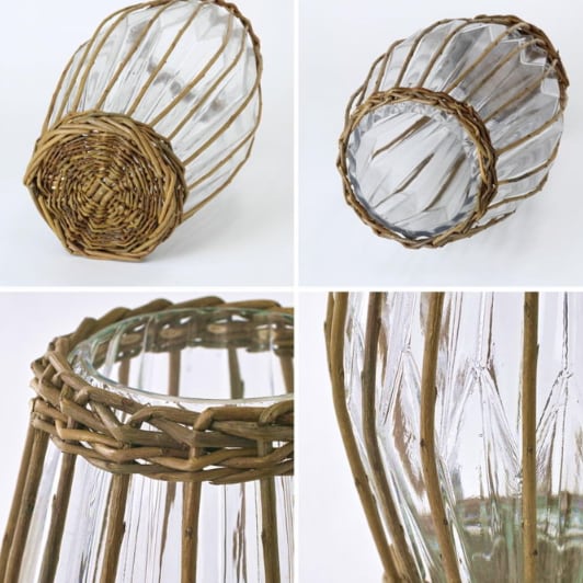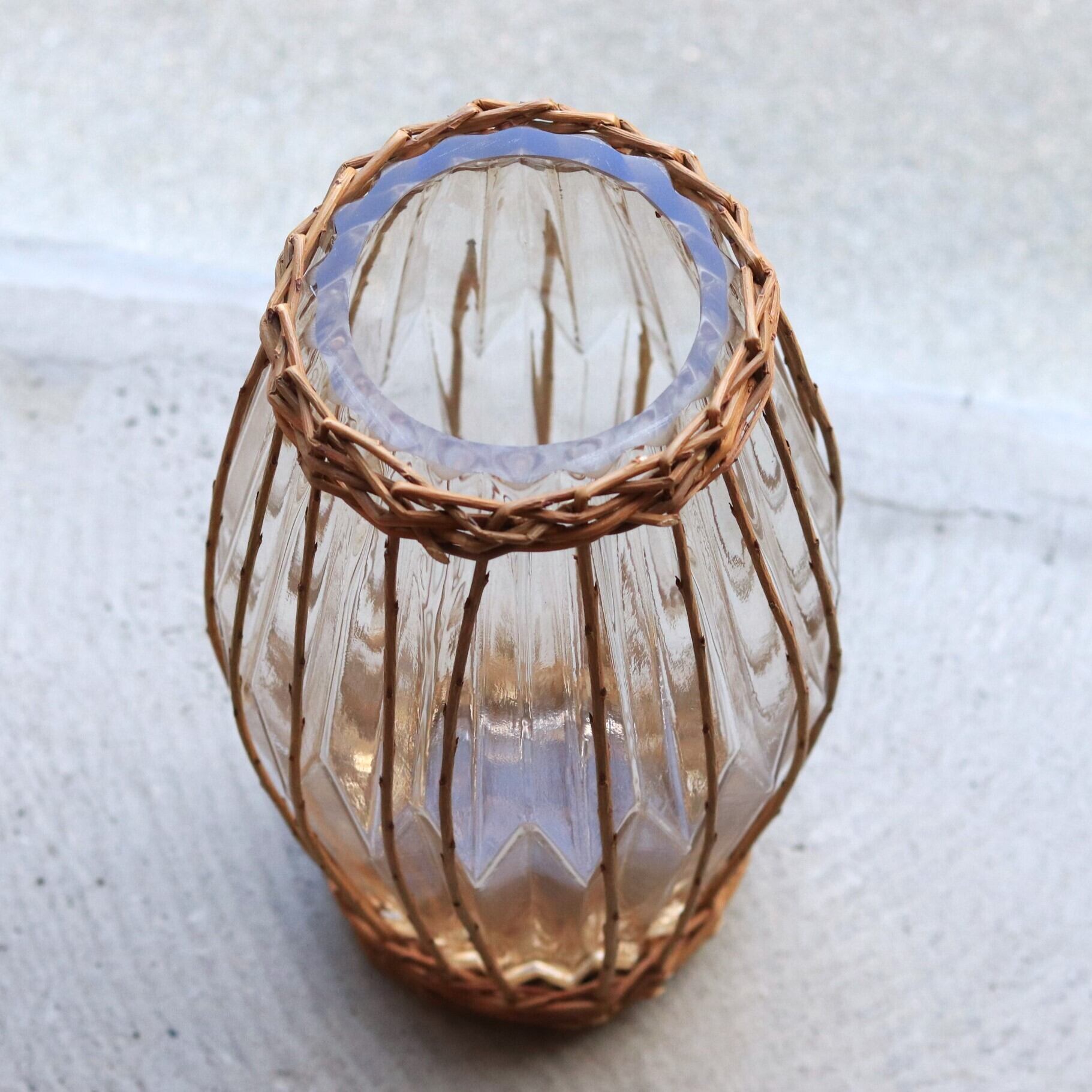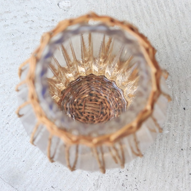 ガラスの形状にぴったり合わせて柳のカゴを編み込んでおります。