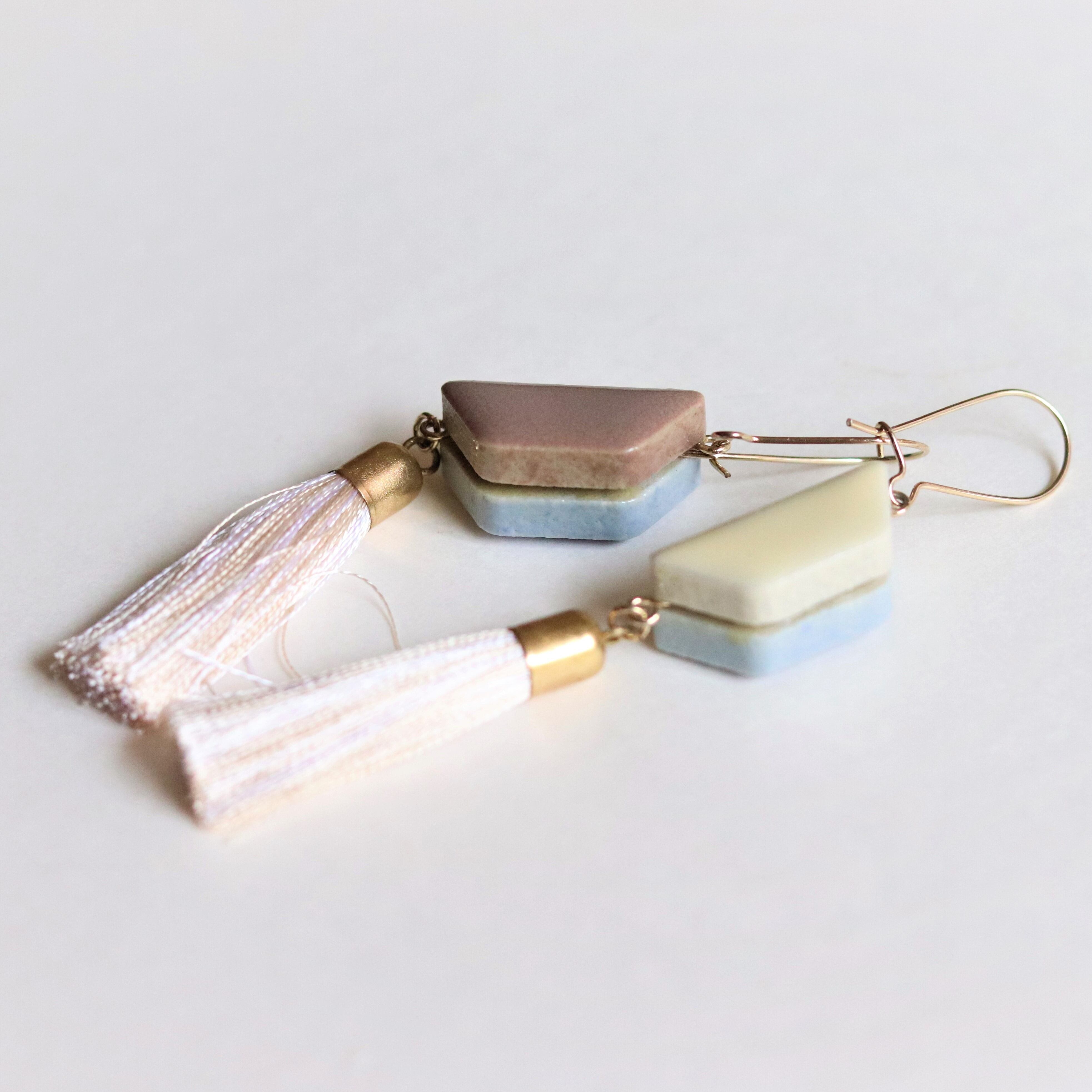 色が異なる台形タイルを組み合わせ、厚みを出したピアスです。