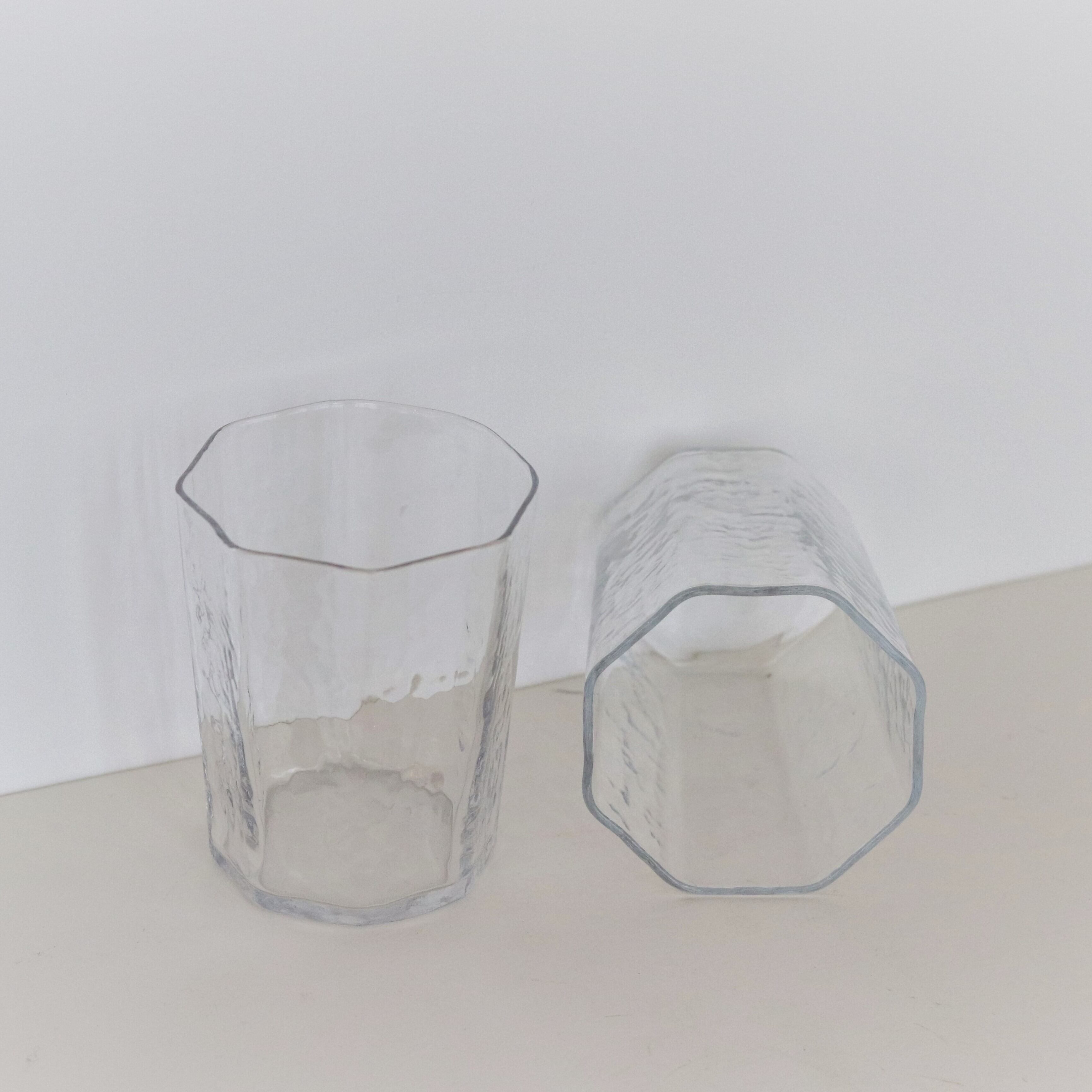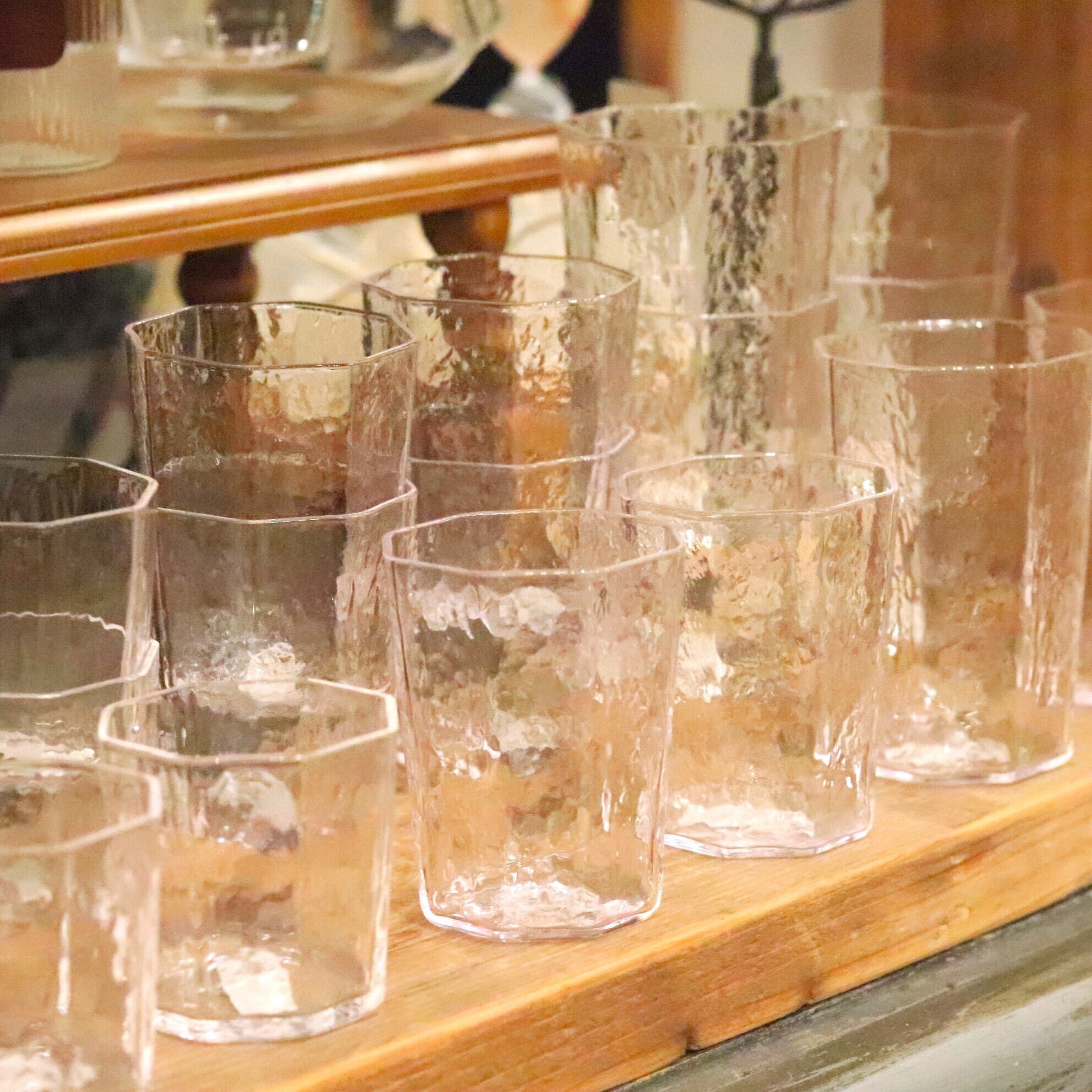 八角形タンブラーMサイズ 普段使いにちょうどいいサイズ感。 ご自身やご家族用はもちろん、 来客用のグラスとしても用意しておきたい頼れる存在。 エンボス模様の手吹きグラスです。 重ねて収納できるのも嬉しいポイント。 プレゼントにもおすすめです。 サイズ:直径8cm、高さ9.5cm 容量:300ml