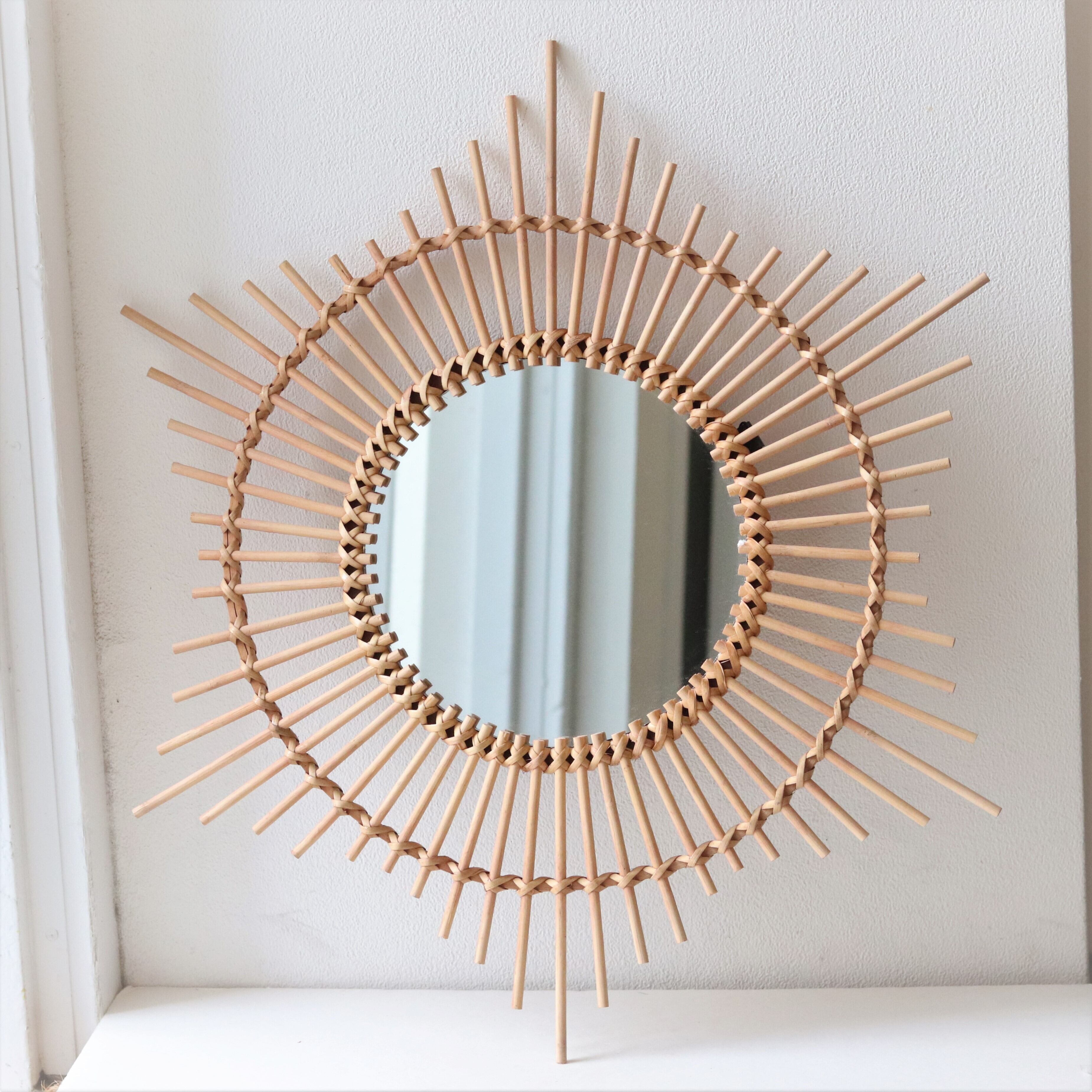 ミラーを取り囲む長いラタンが印象的で、