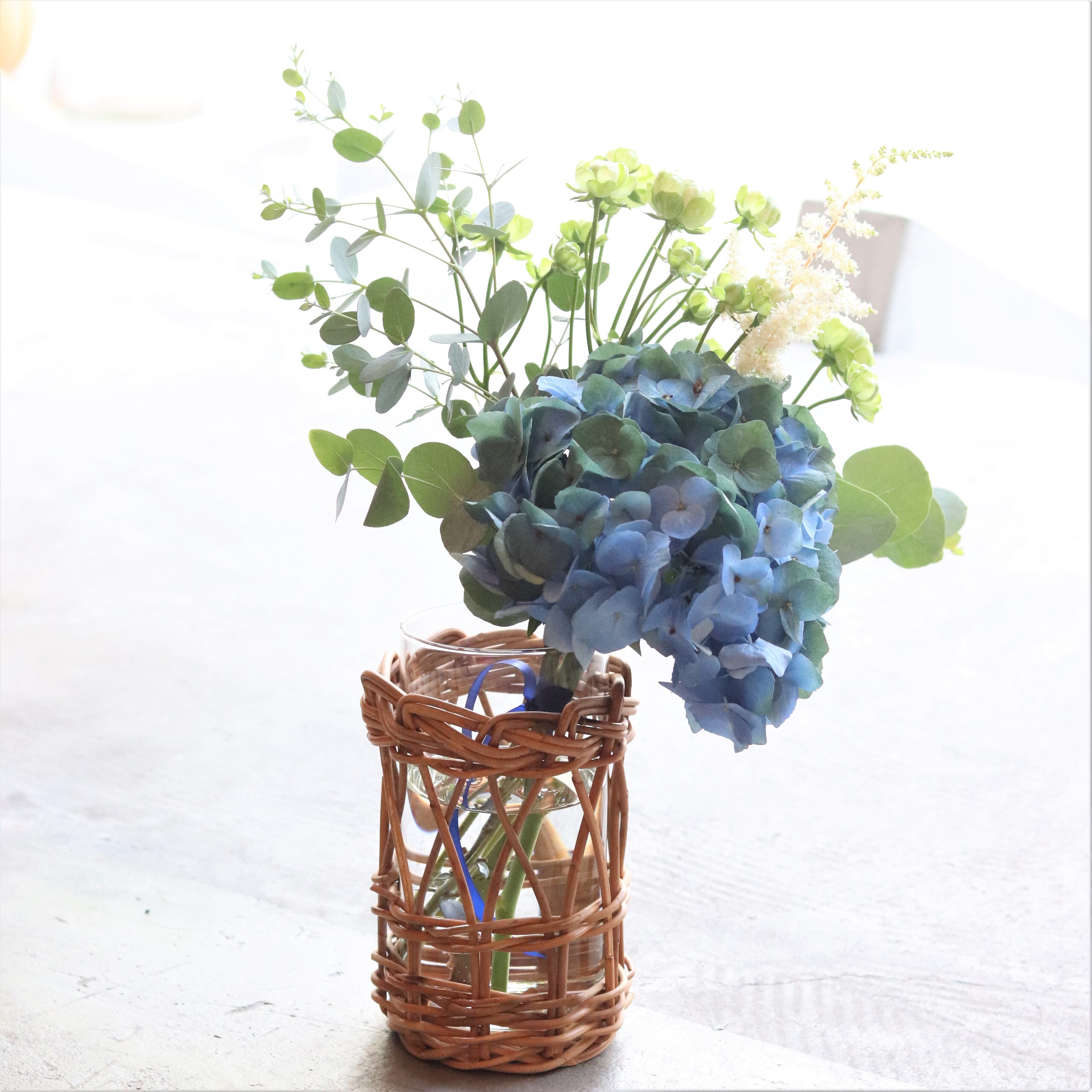 皮付きラタンで編まれたバスケットとガラスベースをセットにしました。