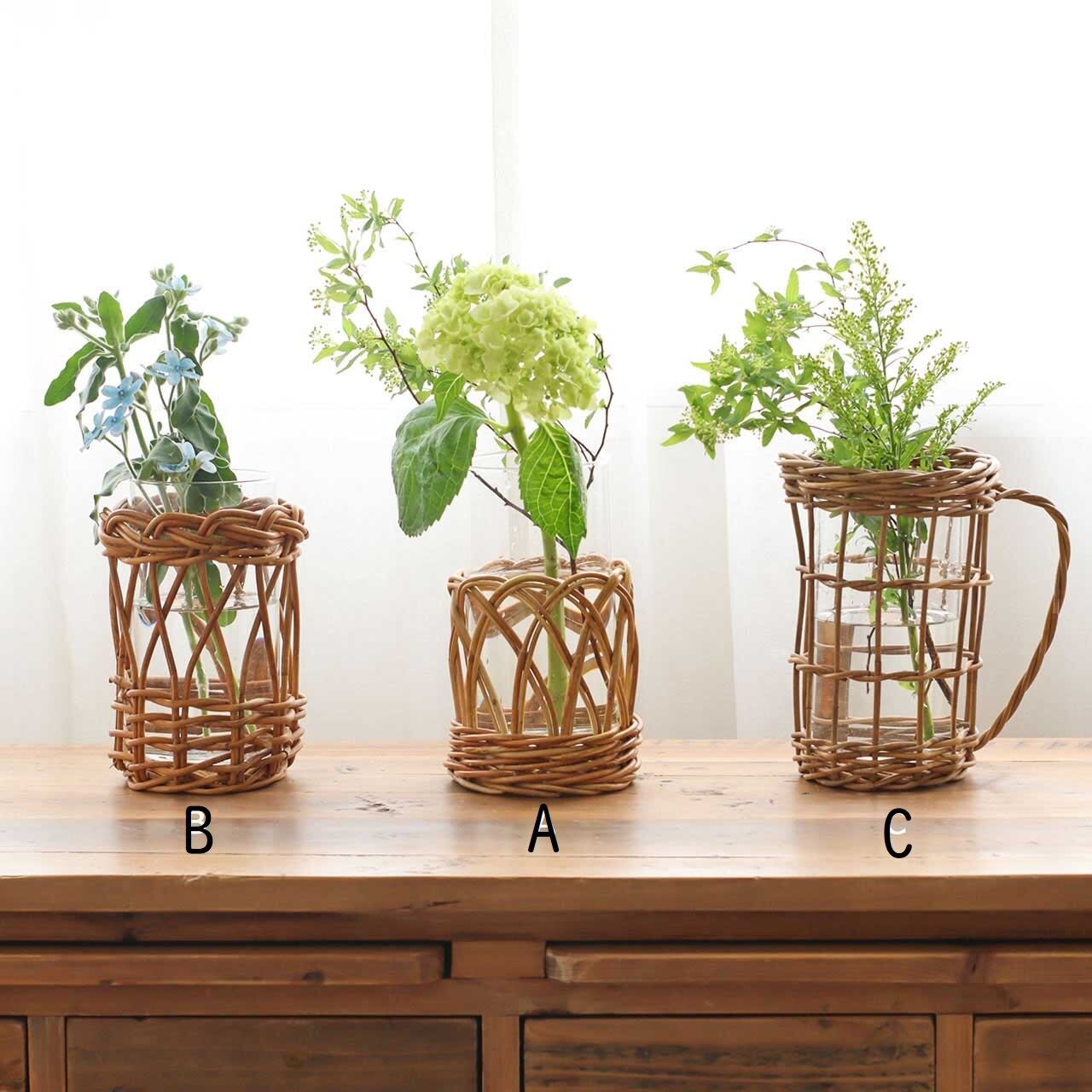 皮付きラタンで編まれたバスケットとガラスベースをセットにしました。