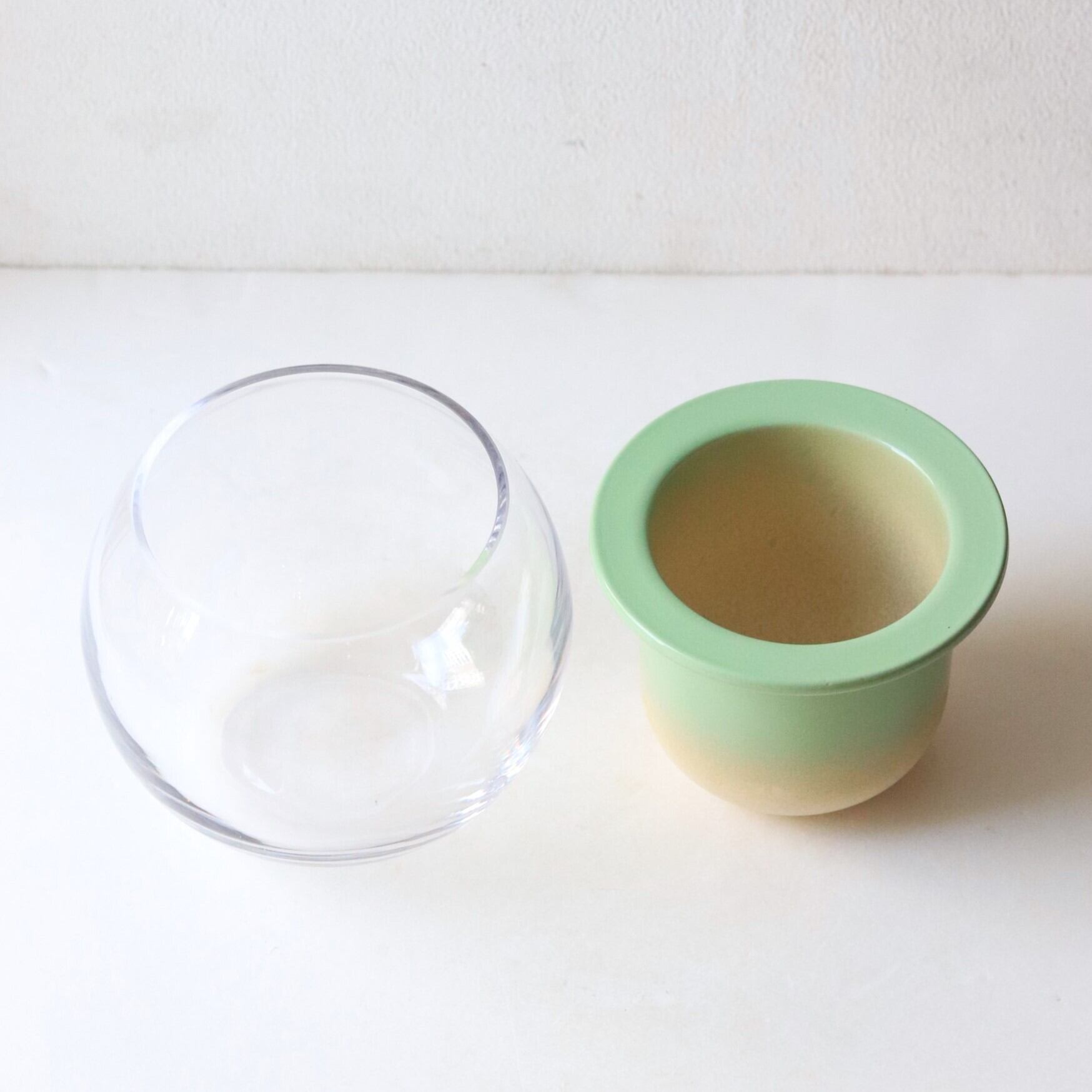 陶器鉢の上にガラス鉢を重ねてお使いいただくプラントポットです。