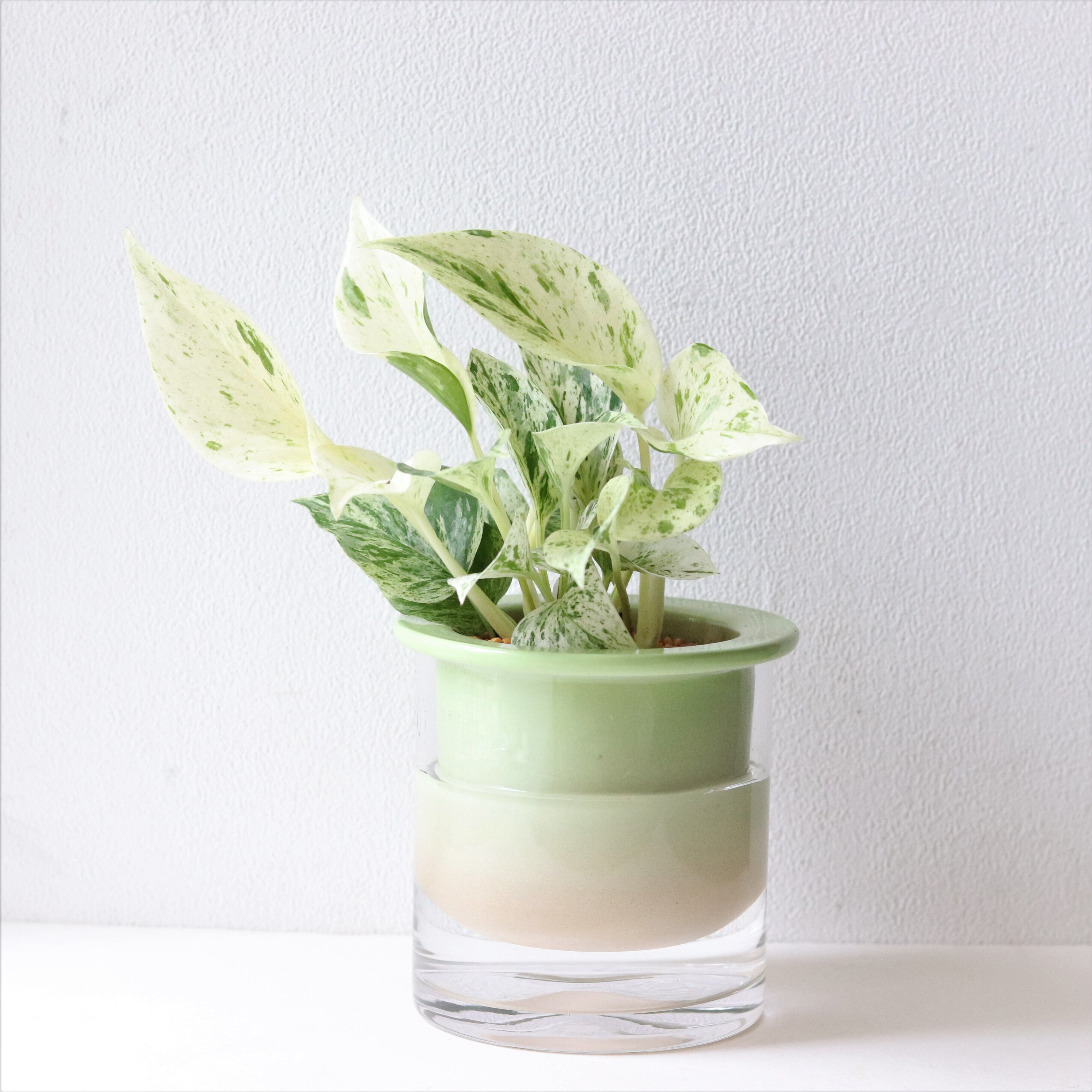 ガラス鉢に溜めた水を陶器鉢が底面吸水することで植物を育てます。