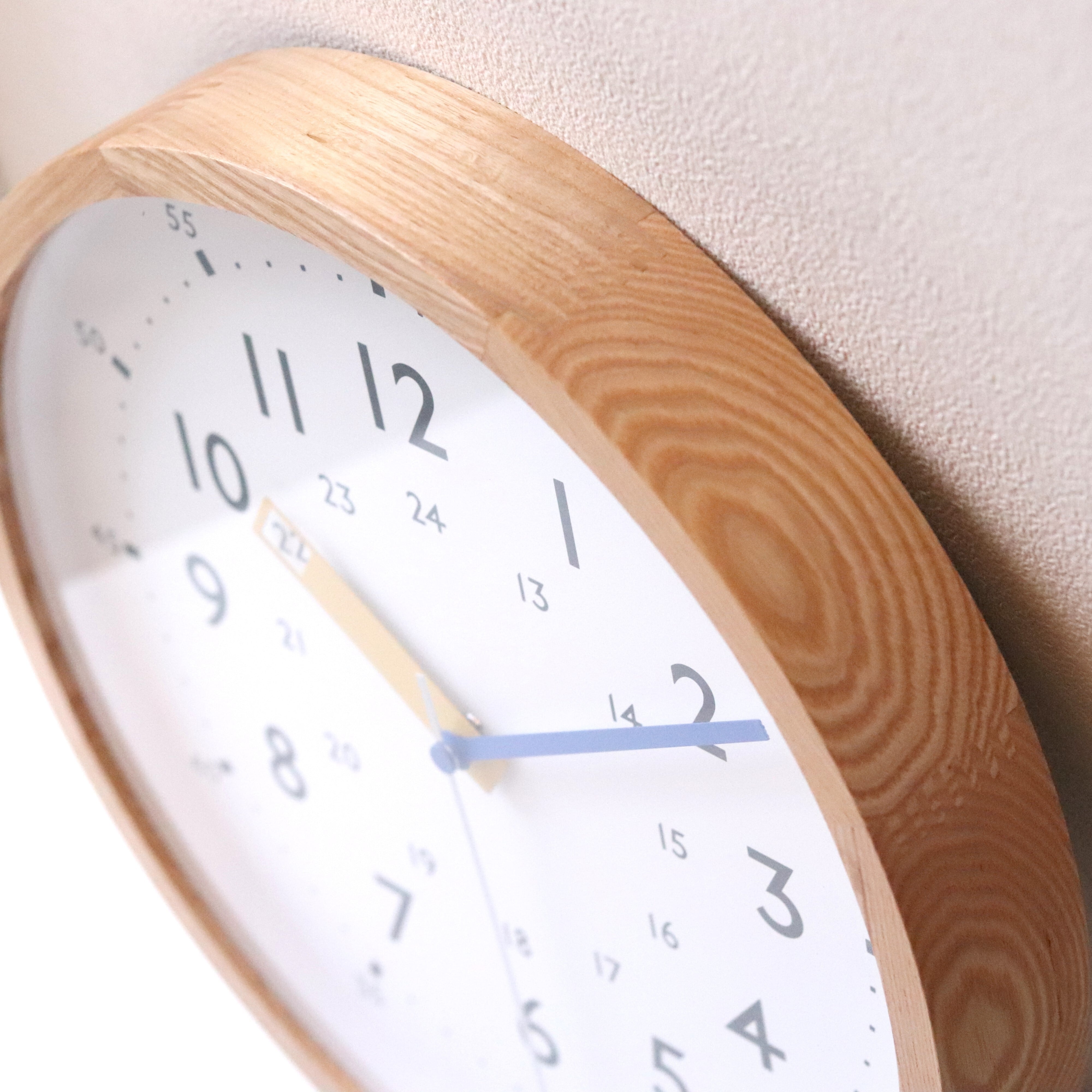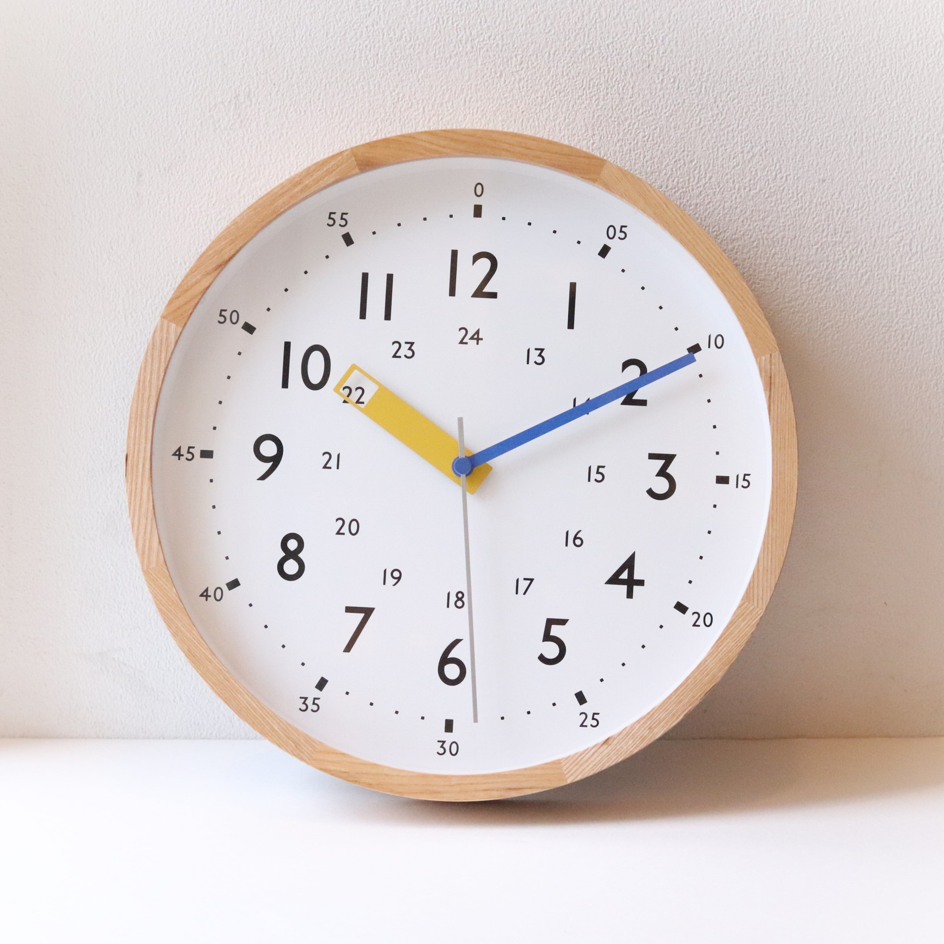 温かみのある木目フレームにカラフルな針が進む掛け時計。