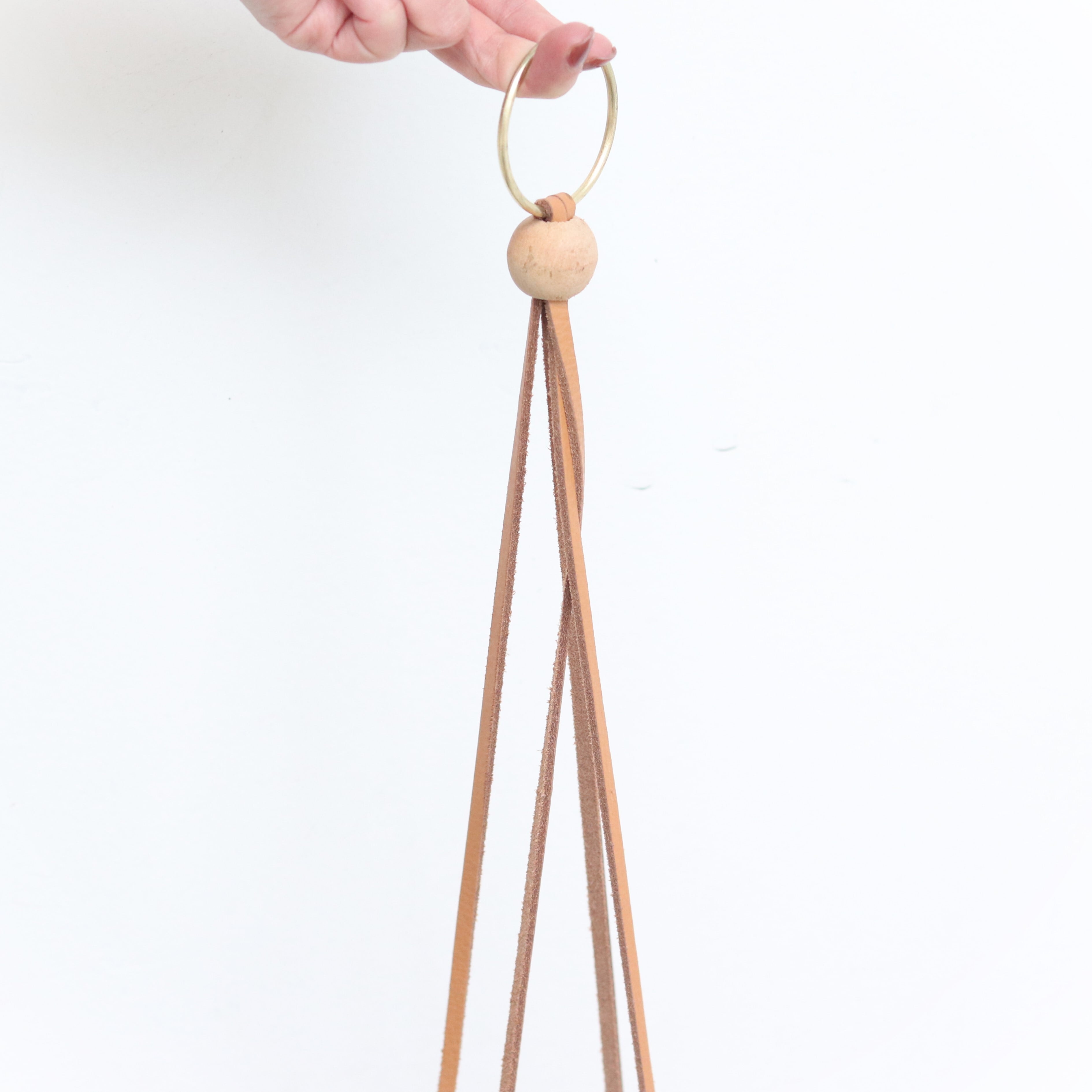 キャメルカラーの革素材に木製ボール4点がアクセントになった一品です。