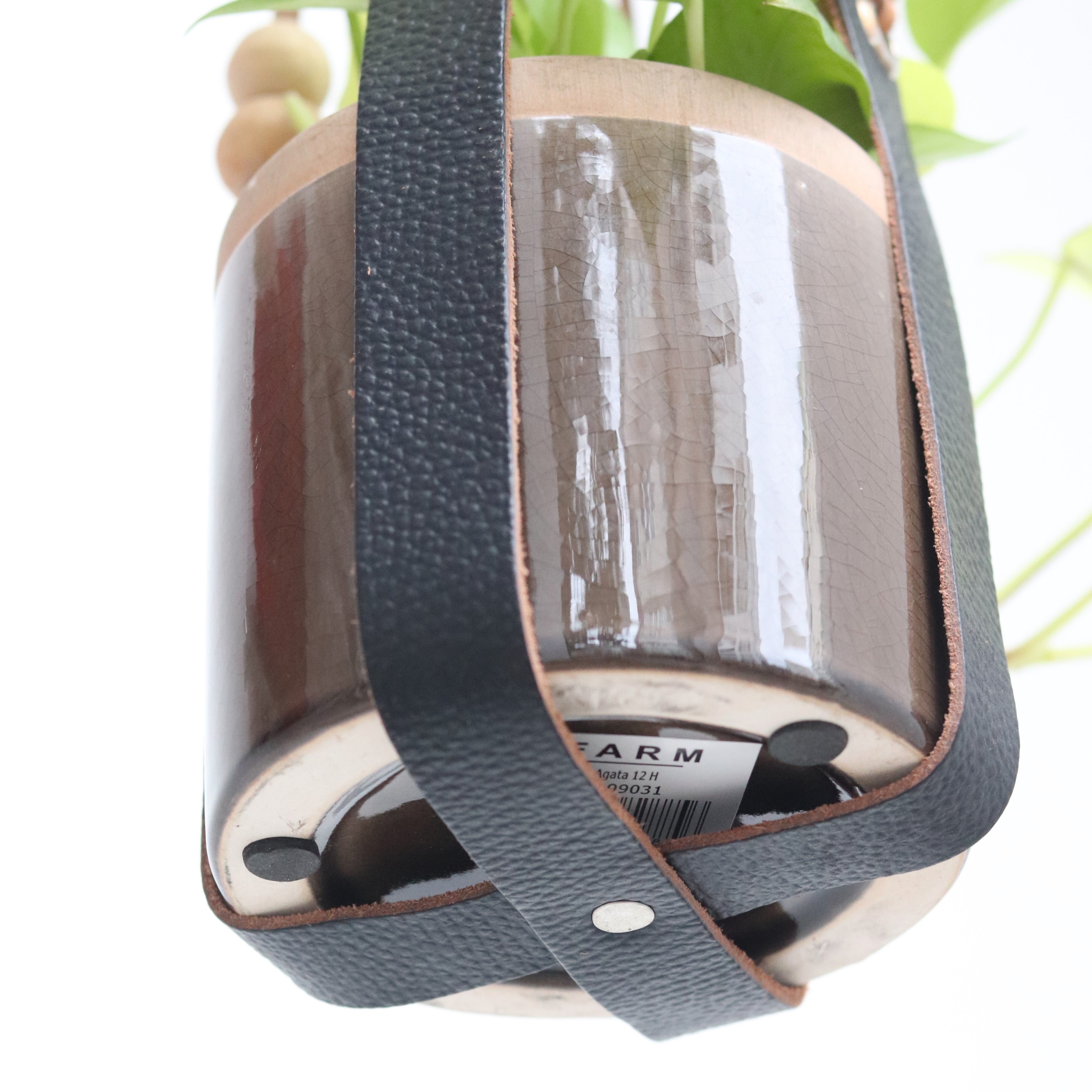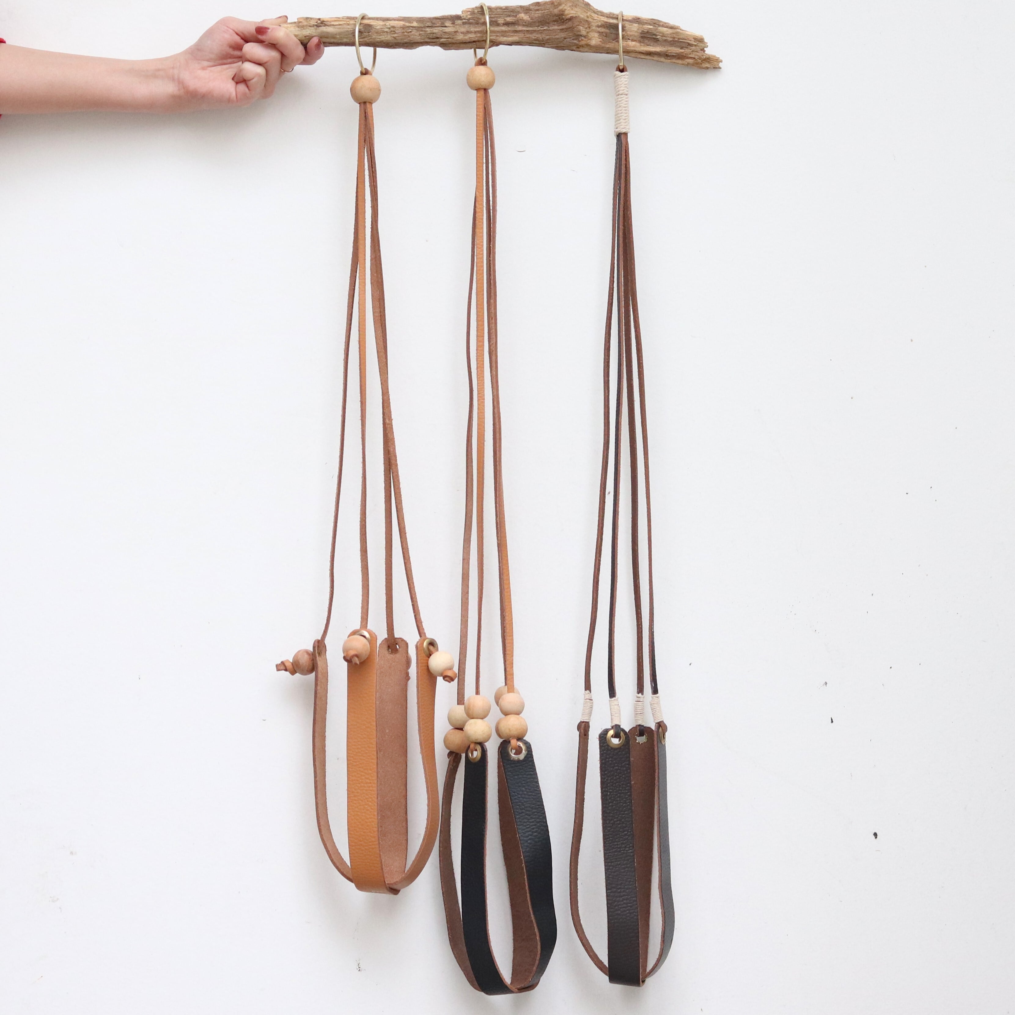 ブラックカラーの革素材に木製ボール2点が連なり、