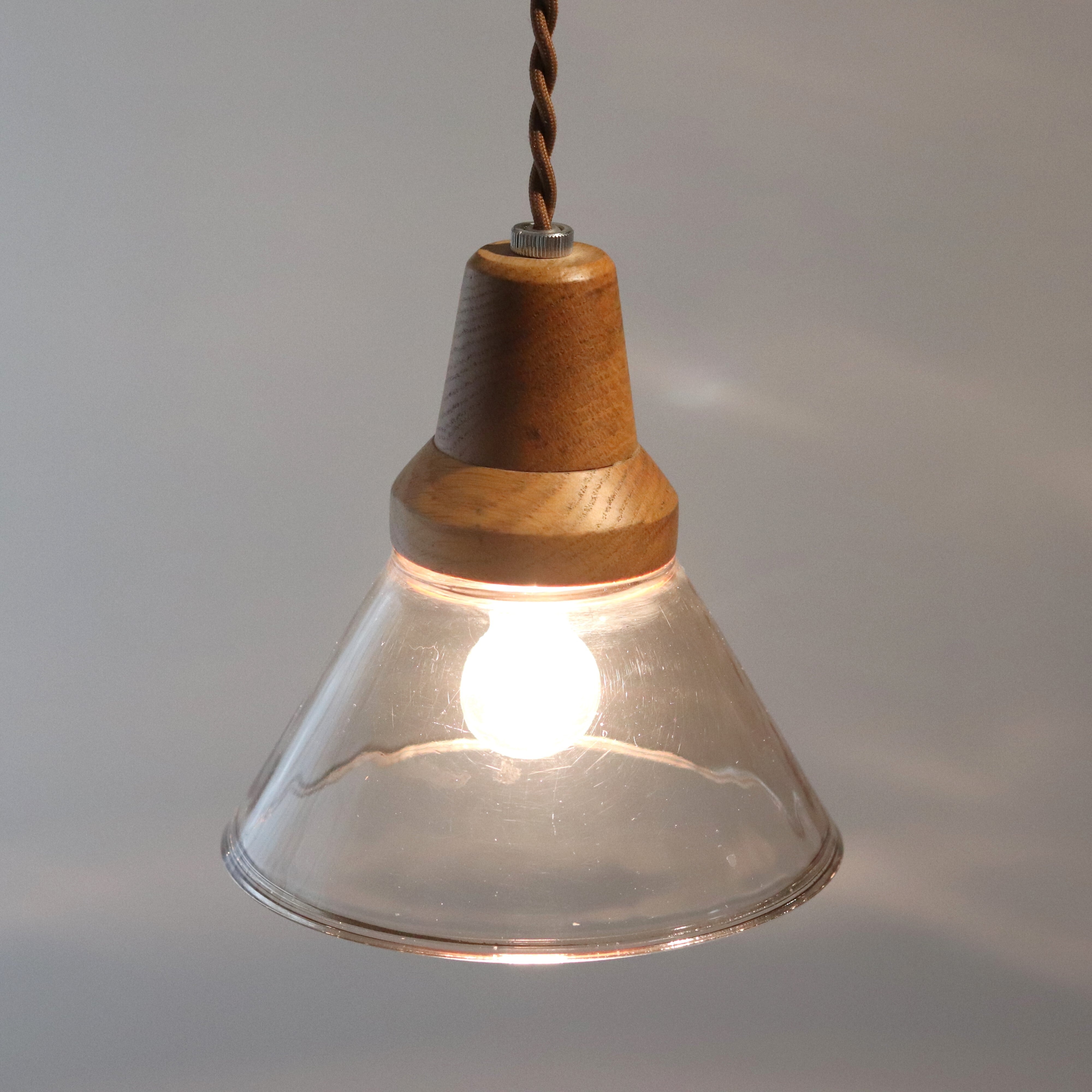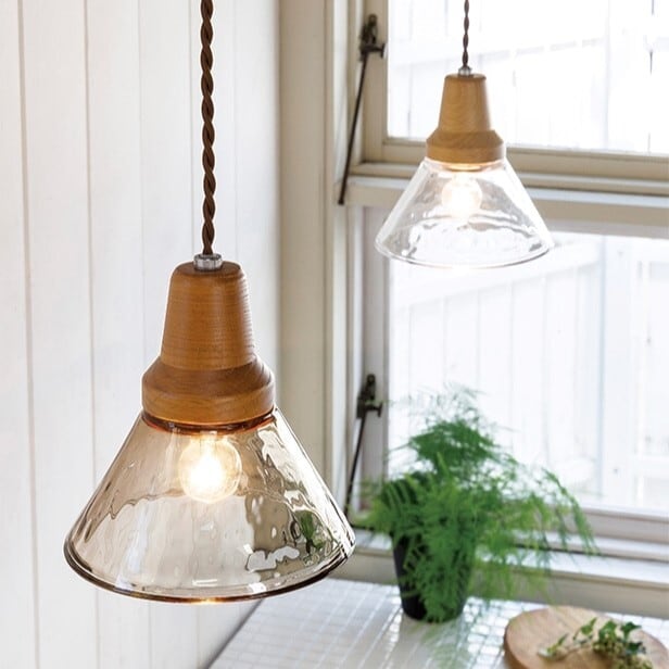 ガラスとウッドを合わせたハンドベルのようなフォルムのペンダントライト。