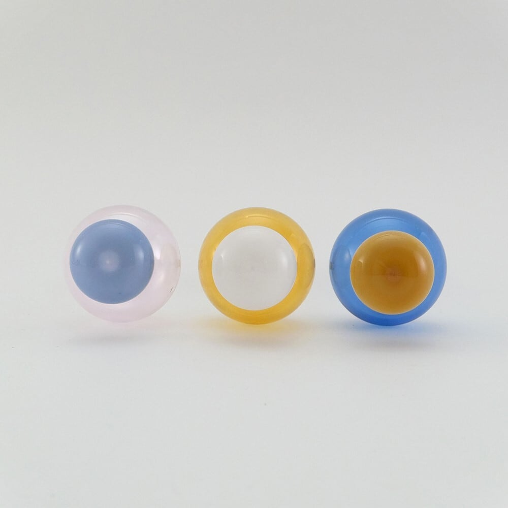 *素材について、職人が型吹きで仕上げており、一つ一つの表情が違うことが特徴です。透明度が低く白濁した外観を持つ「ミルキーガラス」と特殊な製法でコーティングを施し、程よい発色をした「カラーガラス」の2種類のガラスを使用しています。
