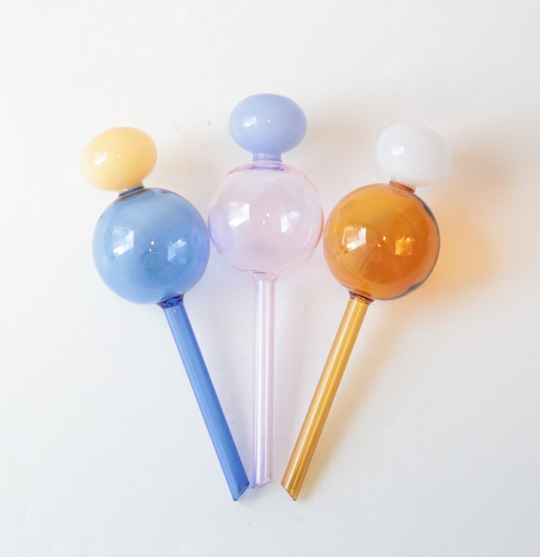 ガラスにヒビ、カケの入ったものは絶対に使用しないでください。洗浄の際、金属タワシやクレンザーなどの使用はキズや破損の原因になりますのでお避けください。一つひとつ手仕事で仕上げられていますので、色・形に若干の個体差があります。製造の工程上、ガラスの溜まり、ラインが入っているものがあります。下穴を開けずに水の入ったディスペンサーの先端を直接挿し込むと筒部分に土が詰まり、うまく水が排出されなくなりますので、ご注意ください。水が減らない場合は、土詰まりしている可能性があります。その場合は、洗浄してからご使用ください。液体肥料を入れてご使用する場合は、お使いの肥料に記載されている希釈率に従ってご使用ください。筒部分に土や小石が詰まったり汚れが付いた場合は、付属のブラシを使って洗浄してください。土や小石が混じった水は内部に残りやすく、水が排出しにくくなりますが、水を回転させながら先端部分を斜めに傾けることで勢いよく水が排出されます。