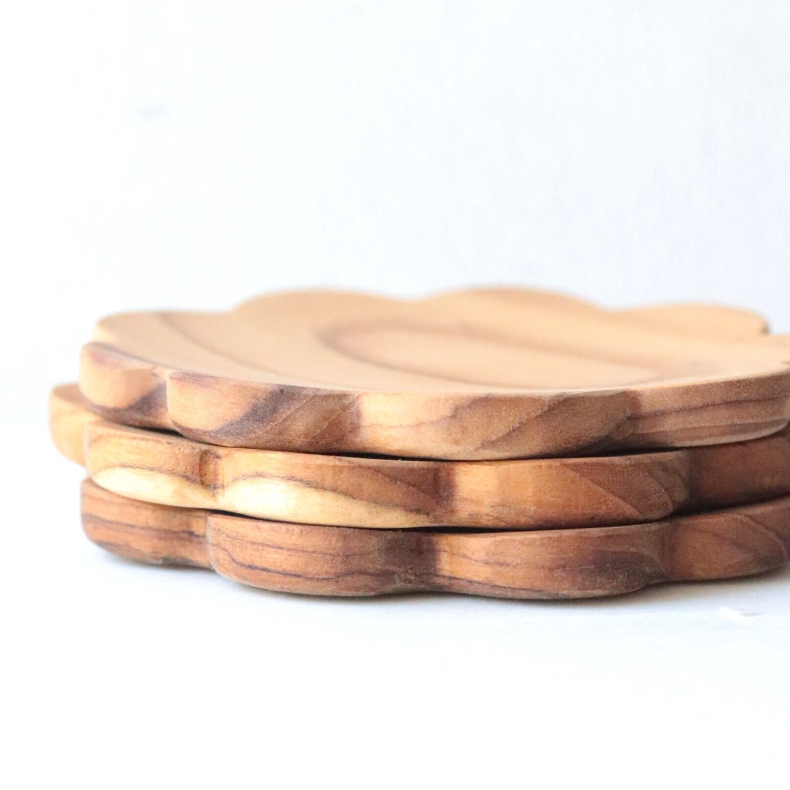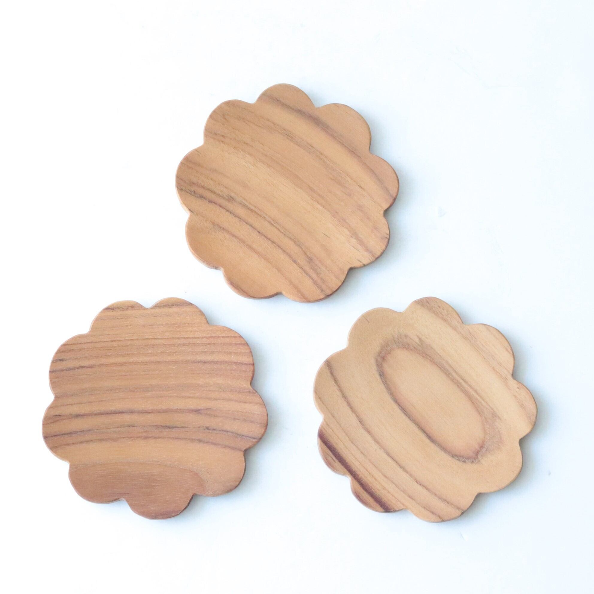 チークの美しい木目が綺麗な花型のコースター