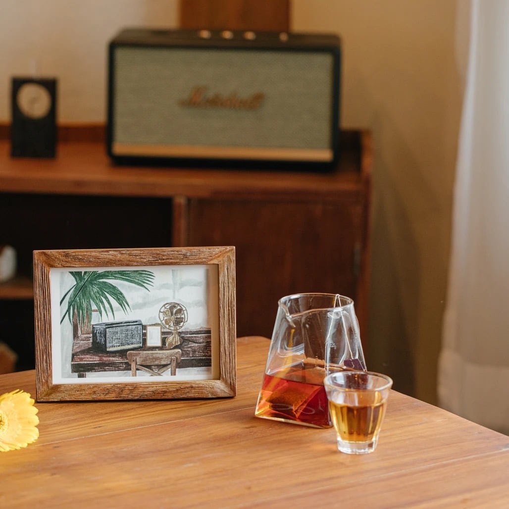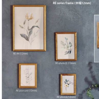 ボタニカルな水彩画が入ったシンプルな木枠のフォトフレーム。